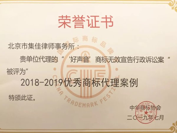 >完美对战平台>关于我们>荣誉概览>2019>集佳代理“好声音”商标无效宣告行政案入选“优秀商标代理案例”