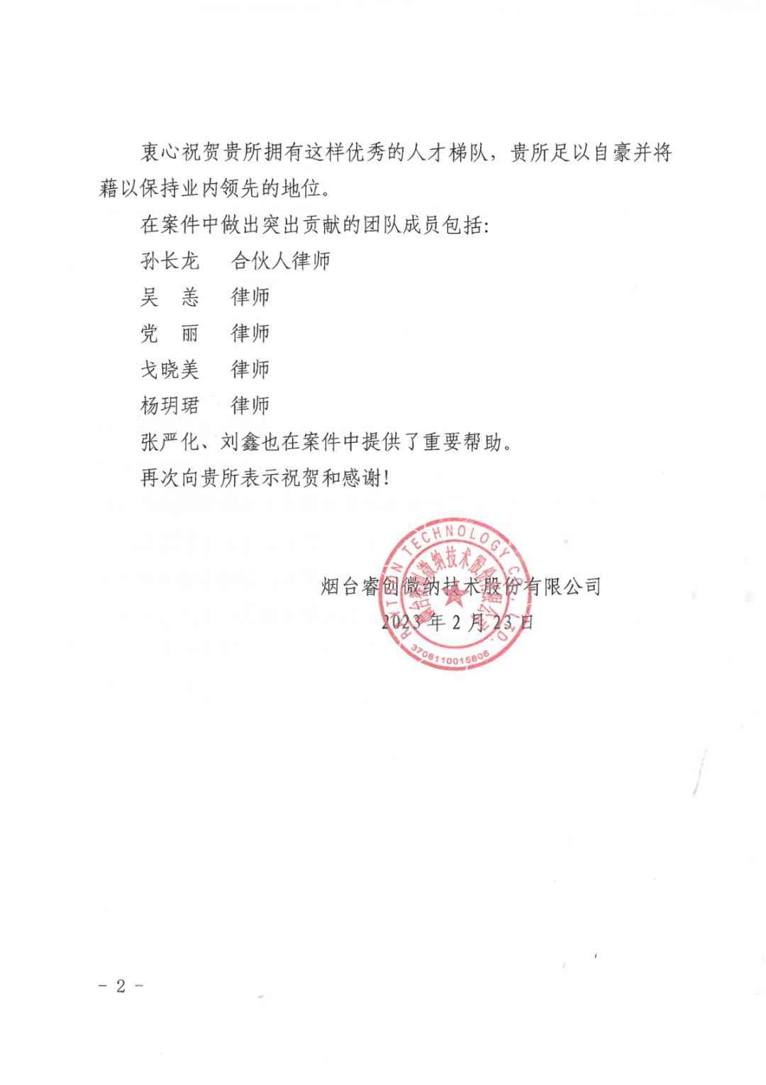 图1 睿创集团向完美对战平台寄送的表扬信
