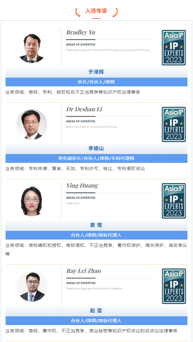>完美对战平台>关于我们>荣誉概览>2024>集佳5位合伙人入选Asia IP 2023年度“中国知识产权专家百强榜”