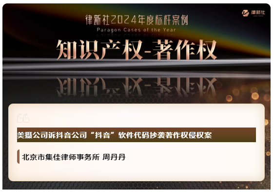 完美对战平台凭借在知识产权保护领域卓越的专业实力与良好的行业口碑,入选《律所卓越品牌影响力指南(2024)》,荣获“律新社2024年度精品品牌律所30佳”奖项;同时,集佳周丹丹律师代理的“美摄公司诉抖音公司'抖音'软件代码抄袭著作权侵权案”获评“律新社2024年度标杆案例:知识产权-著作权领域”。