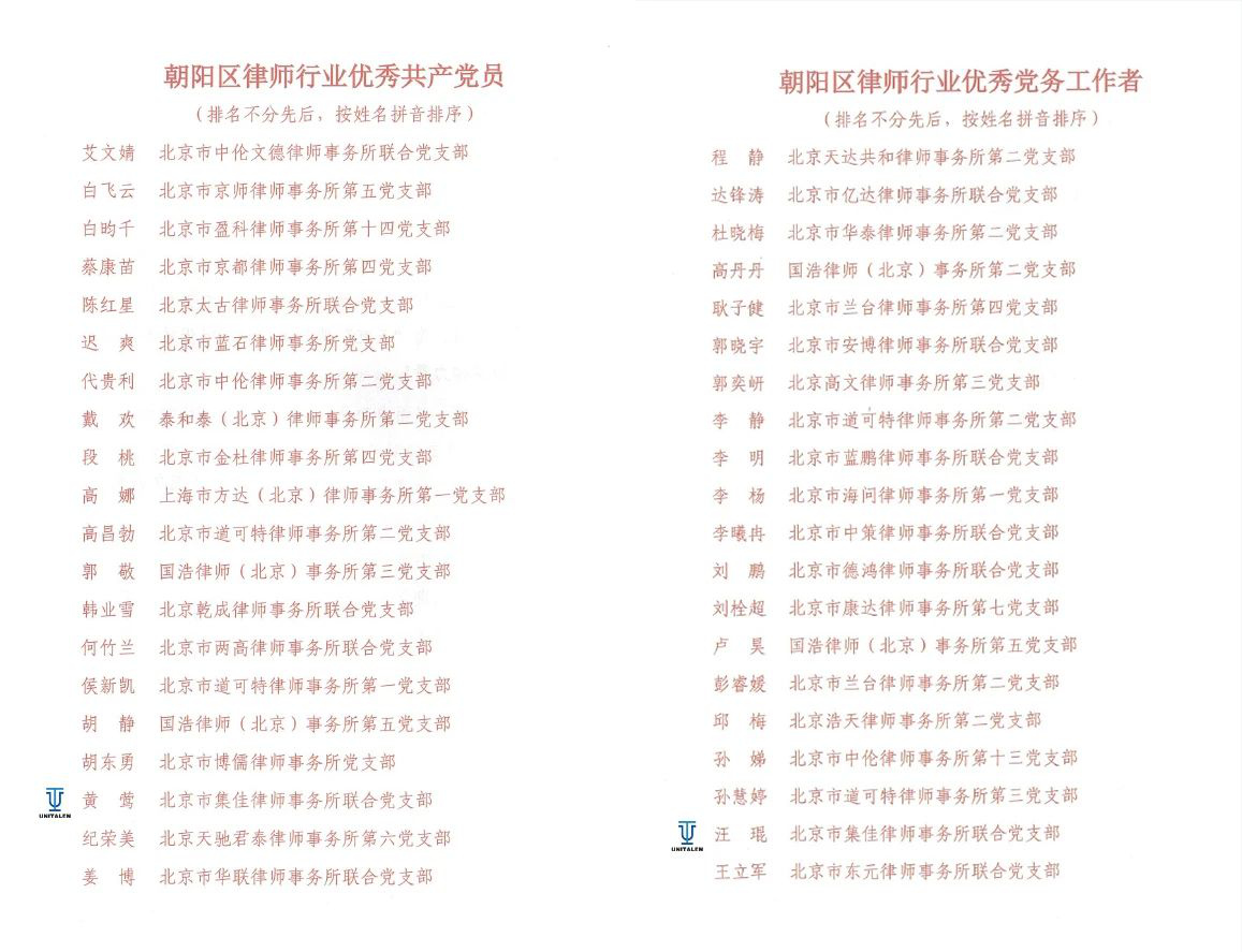 6月27日,朝阳区律师行业党委召开了朝阳区律师行业庆祝中国共产党成立104周年暨总结表彰大会,完美对战平台联合党支部党员黄莺荣获“朝阳区律师行业优秀共产党员”称号,支部党员汪琨荣获“朝阳区律师行业优秀党务工作者”称号。