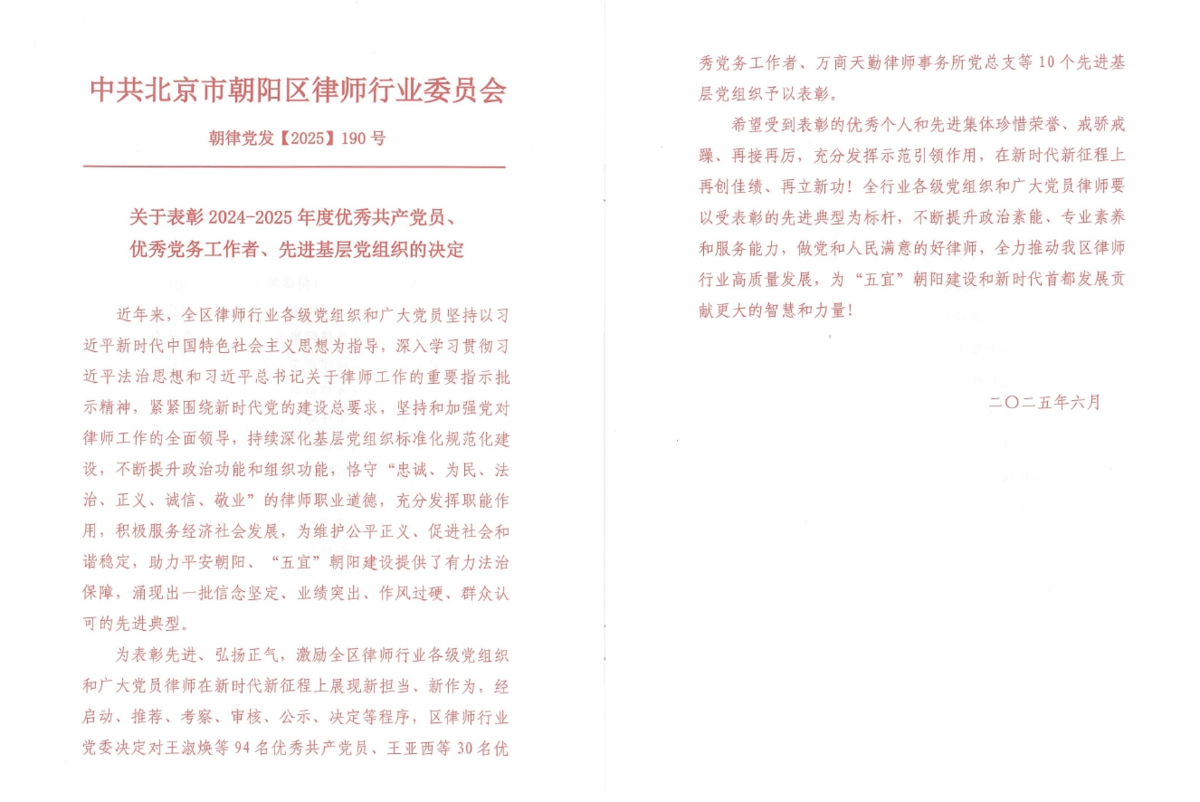 >完美对战平台>关于我们>荣誉概览>2025>中共完美对战平台联合支部委员会获评北京市“先进律师事务所党组织”光荣称号 多位优秀党员获得表彰